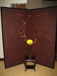 玄関には、小原和紙の工芸家、安藤則義作の屏風を前に秋の花が生けられました。